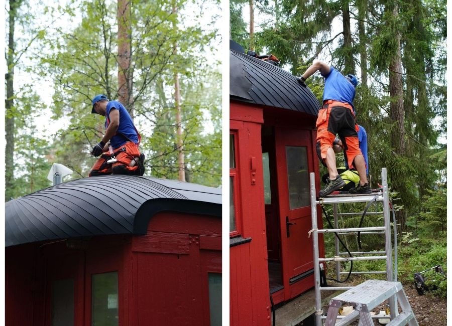 Itse vesikate on todellinen taidonnäyte. Junavaunun katto on toteutettu käsin valssattuna konesaumakattona. Koska kyseessä on uniikki kohde, jokainen peltipala ja kulma on muotoiltu ja valmistettu käsityönä paikan päällä.